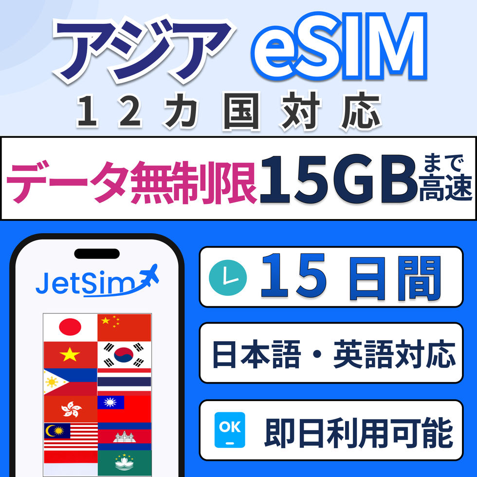 【eSIM】アジア12カ国 15日間-15GB